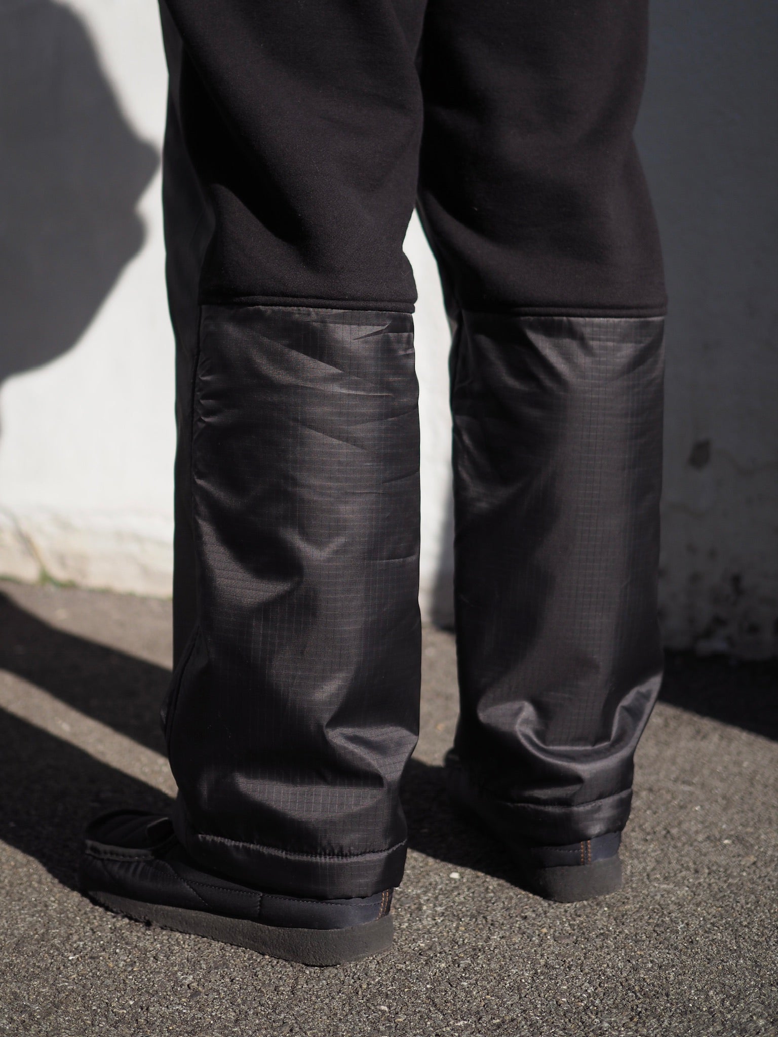 スウェットパンツにリップストップナイロンを貼り付け、アウトドアフィールドでも活躍するタフな楽パンツ